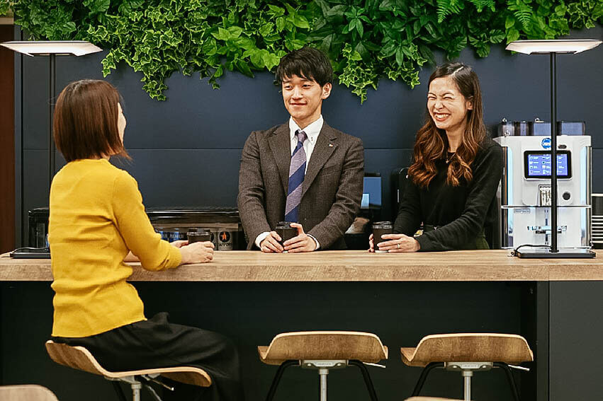 生産性を高め効率良く働ける職場づくりを進めることで、労働時間の短縮に取り組んでいます。打ち合わせは短時間、付き合いだけの飲み会もありませんが、一方で新オフィスには誰でも気軽にコミュニケーションが取れるように無料のバーカウンターを備えています。