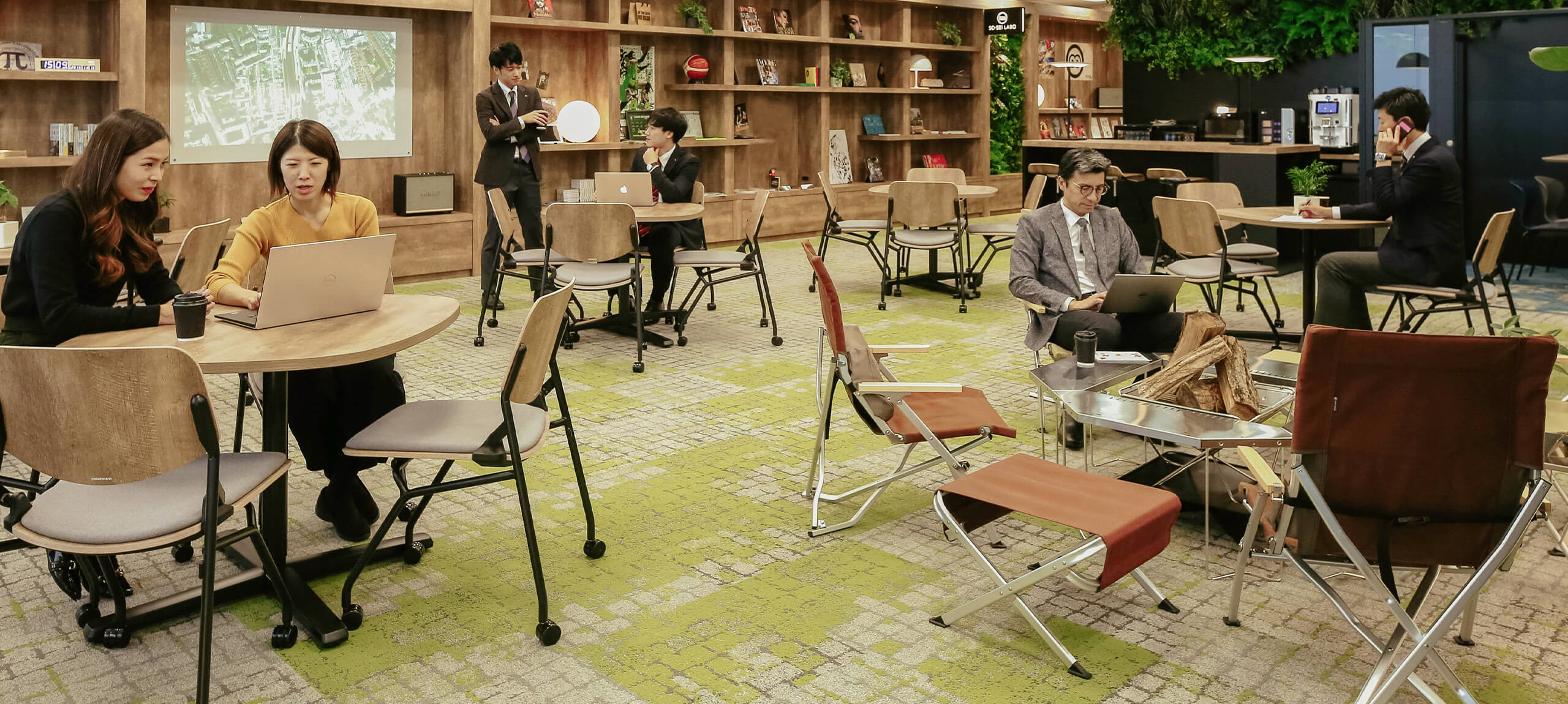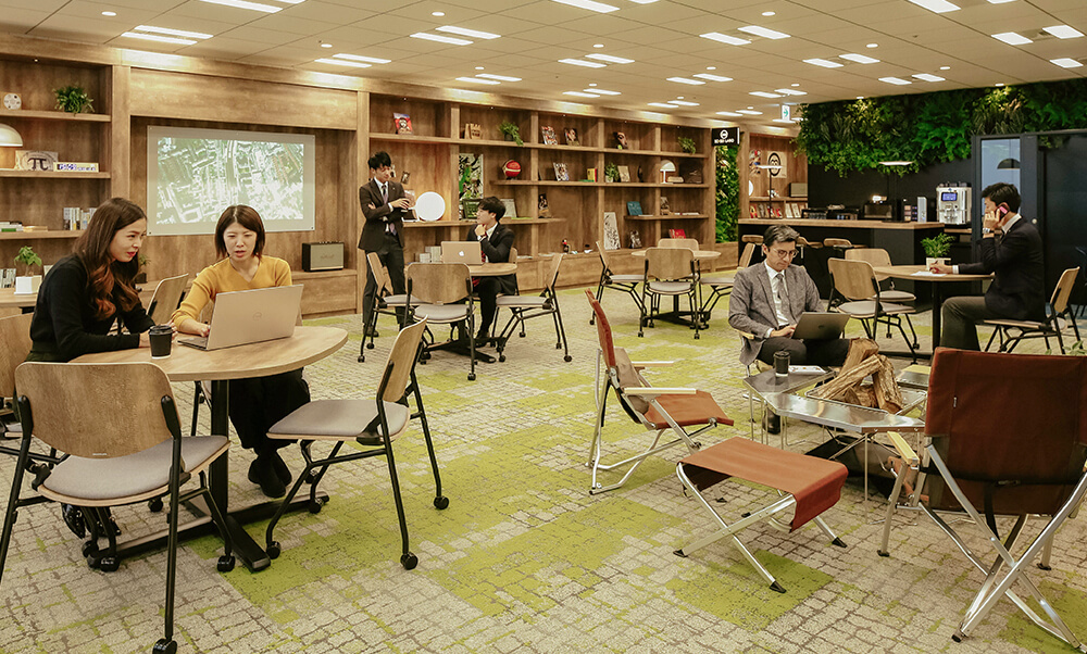 - 生産性を高め効率良く働ける職場づくりを進めることで、労働時間の短縮に取り組んでいます。打ち合わせは短時間、付き合いだけの飲み会もありませんが、一方で新オフィスには誰でも気軽にコミュニケーションが取れるように無料のバーカウンターを備えています。