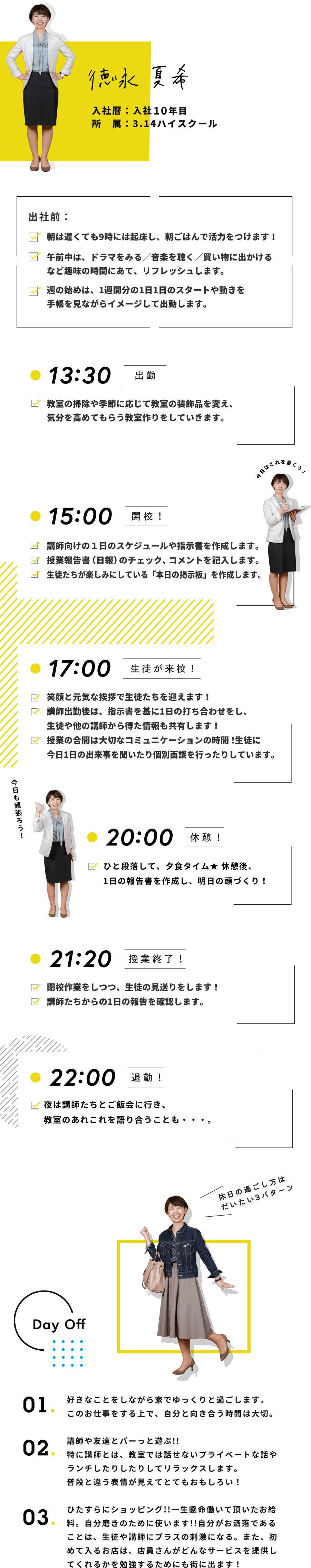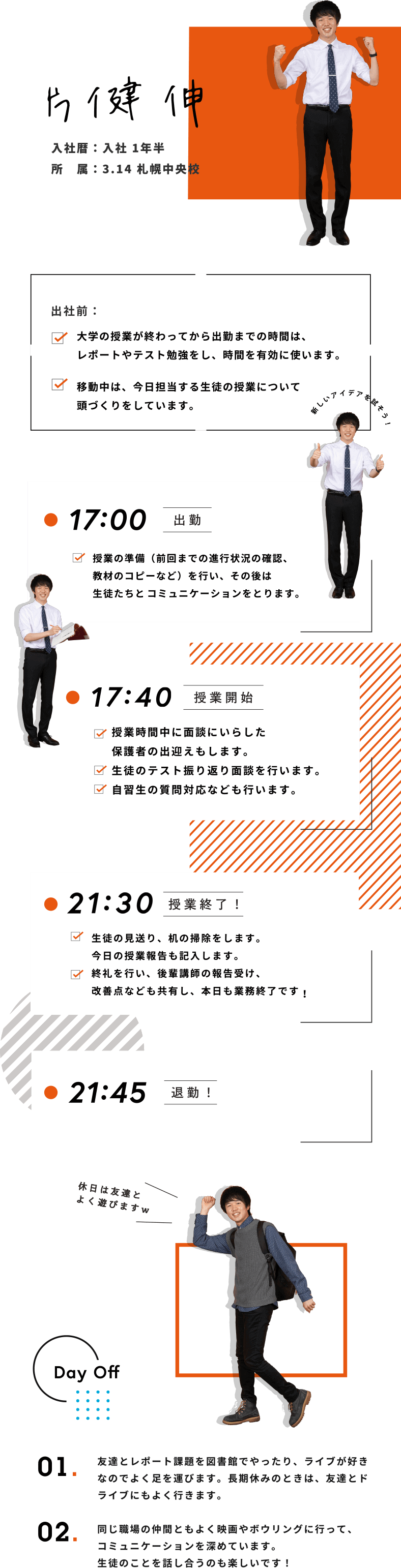 休日や自分の時間をどのように使っているのかなど、社員と学生講師の1日の過ごし方を見てみましょう!