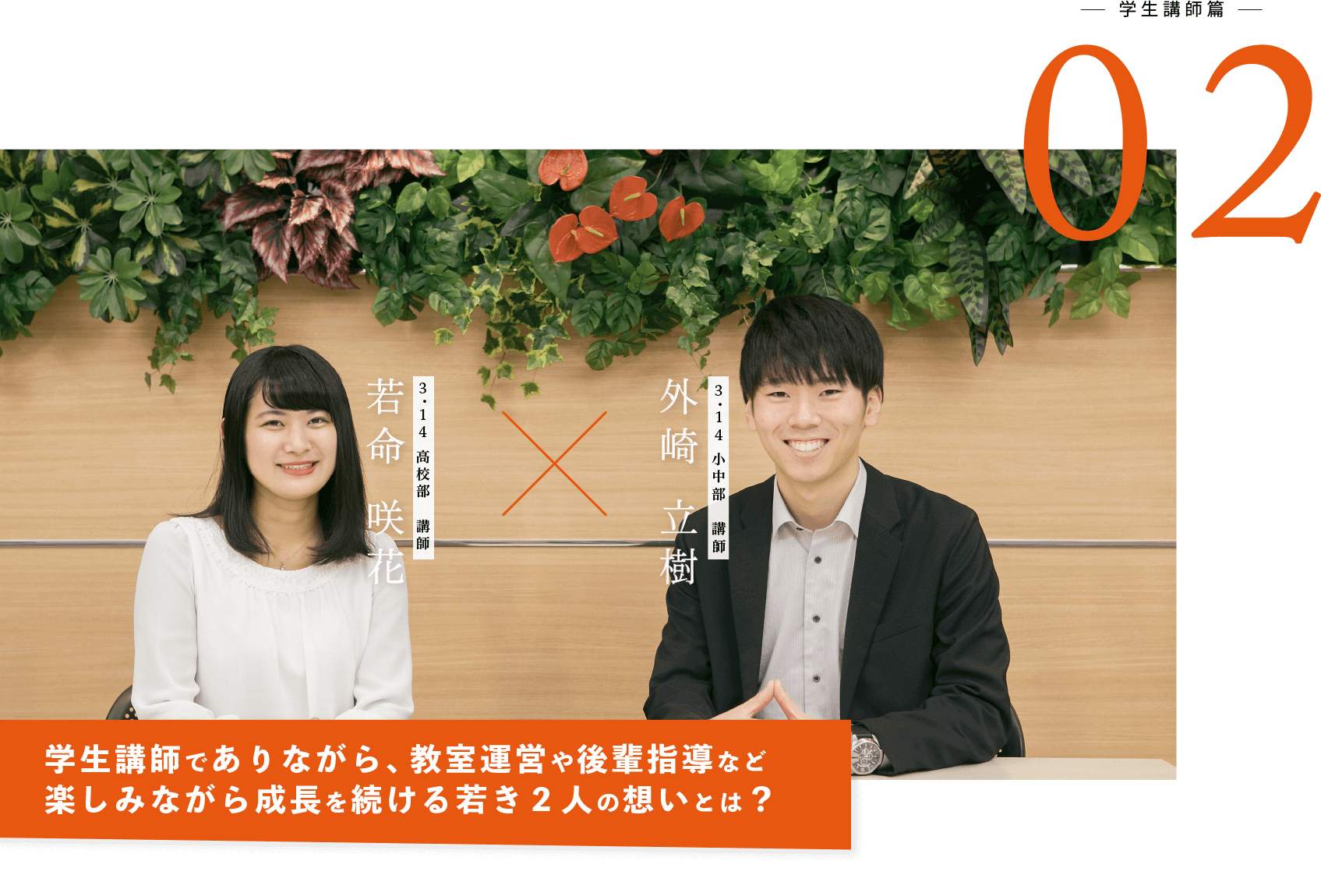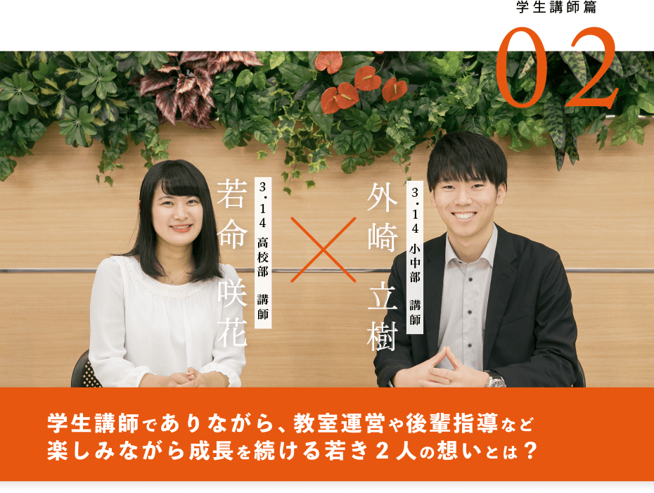 若命 | そうですね。私は元々個別指導3.14の小中部に通っていて、そのまま高校部にも3年間通っていたのですが、大学生になったら講師にならないかって、小学生の頃からずっと言われていました(笑) |